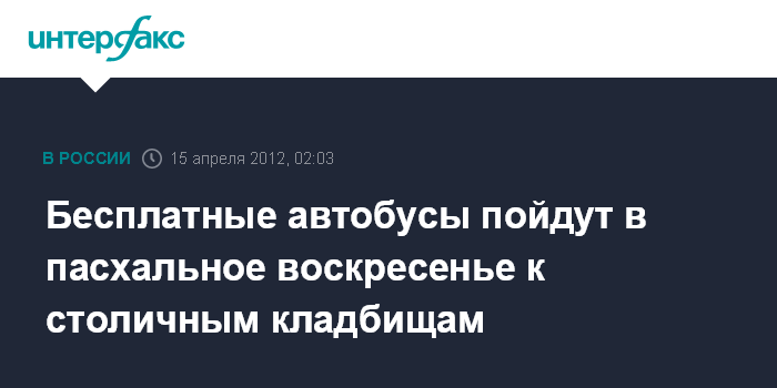 Москва. 15 апреля. ИНТЕРФАКС-МОСКВА - Мосгортранс организует в воскресенье работу 41 специального автобусного маршрута от станций метро и железнодорожных платформ к 16 крупным кладбищам Москвы.