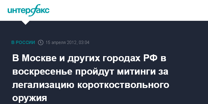 "15 апреля в Москве в 14:00 на площади Краснопресненская застава у памятника "Героям революции 1905-1907г." начнется митинг с требованием возврата прав граждан на короткоствольное нарезное огнестрельное оружие", - сообщили "Интерфаксу" в организации в пятницу.