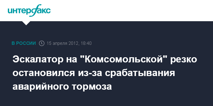 Москва. 15 апреля. INTERFAX.RU - В результате падения на эскалаторе в московском метро пострадали семь человек, сообщила "Интерфаксу" пресс-секретарь департамента транспорта и развития дорожно-транспортной инфраструктуры Жанна Терехова. "В 11:15 на эскалаторном наклоне станции "Комсомольская" кольцевой линии на выходе к Ленинградскому и Ярославскому вокзалам, эскалатор, работающий на спуск, резко остановился в результате сработавшего аварийного тормоза", - сказала Ж.Терехова.