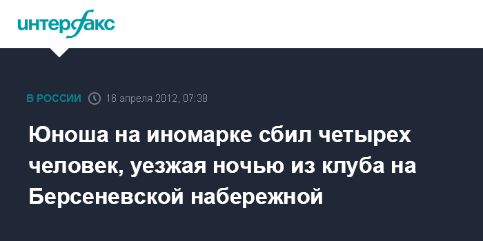 Москва. 16 апреля. ИНТЕРФАКС - Девятнадцатилетний москвич на дорогой иномарке сбил четырех человек и разбил семь автомобилей, уезжая из ночного клуба в центре Москвы, сообщили "Интерфаксу" в пресс-службе ГУ МВД России по Москве.