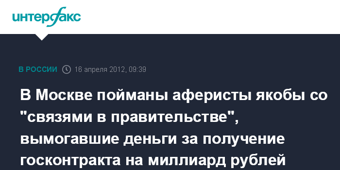 По словам источника, по подозрению в мошенничестве в особо крупном размере задержаны гендиректор коммерческой фирмы и его сообщник. Представляясь доверенными лицами высокопоставленных сотрудников правительства РФ, они обещали бизнесмену за 7,5 млн рублей гарантированную победу в конкурсе на право заключения крупного государственного контракта.