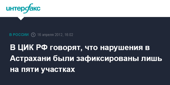 Москва. 16 апреля. INTERFAX.RU - В ЦИК РФ считают, что если нарушения на выборах мэра Астрахани и были, то не более чем на пяти избирательных участках.