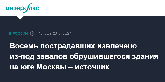 Москва. 17 апреля. ИНТЕРФАКС - Спасатели извлекли из-под завалов обрушившегося строящегося бизнес-центра на юге Москвы восьмерых пострадавших, сообщил «Интерфаксу» во вторник источник в правоохранительных органах.