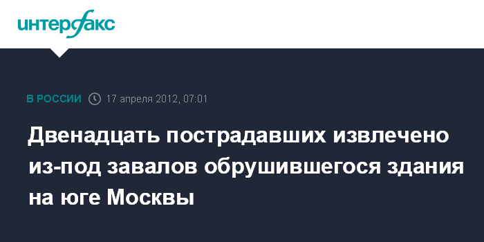 Москва. 17 апреля. INTERFAX.RU - В результате обрушения здания на юге Москвы пострадали 12 человек, один из них погиб, сообщил "Интерфаксу" во вторник источник в правоохранительных органах.