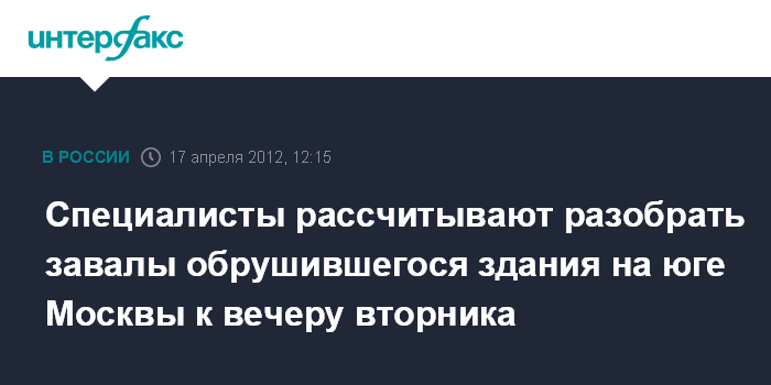 Москва. 17 апреля. INTERFAX.RU - Строители надеются разобрать завалы на месте обрушившегося на юге Москвы здания к концу дня, заявил журналистам во вторник заместитель председателя Мосгосстройнадзора Сергей Мироненко.