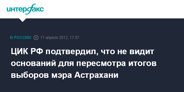 Москва. 17 апреля. INTERFAX.RU - Просмотр видеозаписей о нарушениях на избирательных участках не дает оснований пересматривать позицию ЦИК РФ о легитимности выборов мэра Астрахани.