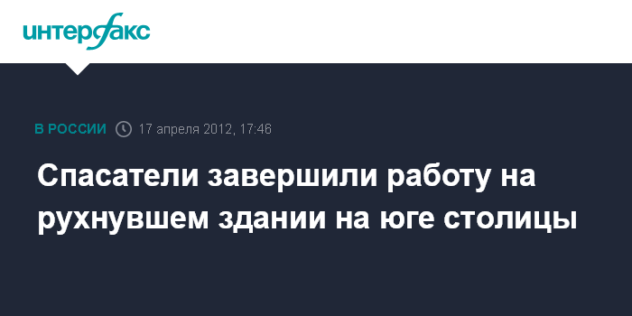 Москва. 17 апреля. INTERFAX.RU - Аварийно-спасательные работы на месте обрушившегося здания на юге Москвы и поиск возможных пострадавших завершены, сообщили "Интерфаксу" в пресс-службе ГУ МЧС России по Москве.
