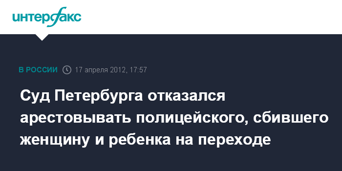 Санкт-Петербург. 17 апреля. INTERFAX.RU - Суд Петербурга пока не стал арестовывать полицейского, насмерть сбившего женщину и ребенка на переходе, сообщил корреспондент "Интерфакса".