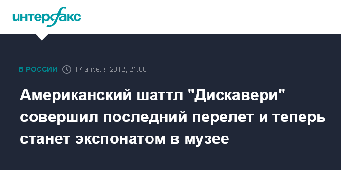 Вашингтон. 17 апреля. INTERFAX.RU - Самолет "Боинг-747" доставил во вторник шаттл "Дискавери" с космодрома на мысе Канаверал (штат Флорида) в международный аэропорт имени Даллеса близ Вашингтона, сообщают местные СМИ.