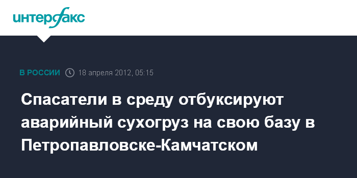 Петропавловск-Камчатский. 18 апреля. ИНТЕРФАКС-ДАЛЬНИЙ ВОСТОК - Спасатели в среду во второй половине дня планируют отбуксировать аварийный сухогруз "Тихон Семушкин" на свою базу в Петропавловске-Камчатском (в район мыса Сигнальный).