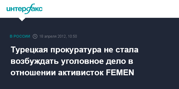 Киев. 18 апреля. INTERFAX.RU - Прокуратура Стамбула отказалась возбуждать уголовное дело в отношении четырех украинок - активисток движения FEMEN за топлес-акцию возле собора Святой Софии в Стамбуле.