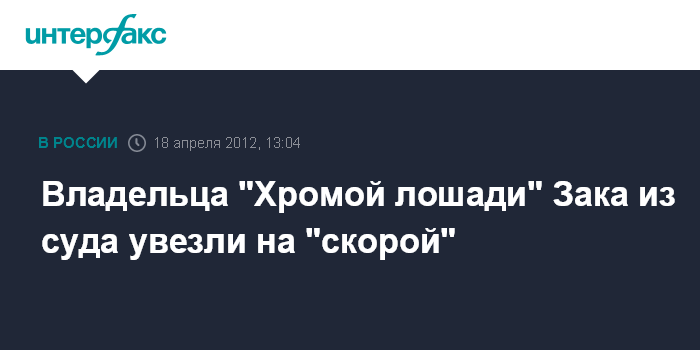 Пермь. 18 апреля. INTERFAX.RU - Владелец "Хромой лошади" Анатолий Зак пожаловался во время заседания Ленинского районного суда Перми на плохое самочувствие, ему была вызвана бригада "скорой помощи", которая отвезла его в больницу.