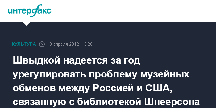 Москва.18 апреля. INTERFAX.RU - Проблема музейных обменов между Россией и США, возникшие в связи с решением американского суда о возвращении в Америку библиотеки Шнеерсона, может быть решена в этом году, заявил спецпредставитель президента РФ по международному культурному сотрудничеству Михаил Швыдкой.