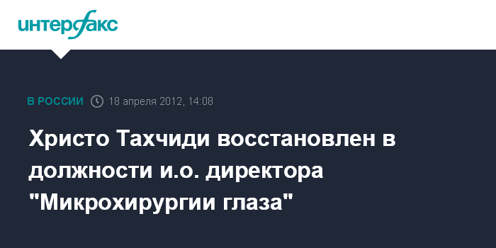 Москва. 18 апреля. INTERFAX.RU - Мосгорсуд восстановил в должности главы МНТК "Микрохирургия глаза" хирурга Христо Тахчиди, сообщили "Интерфаксу" в пресс-службе суда.