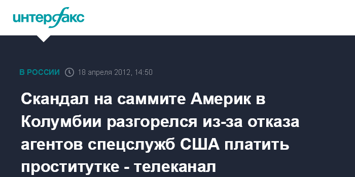 Вашингтон. 18 апреля. INTERFAX.RU - Сексуальный скандал во время саммита Америк в Колумбии разгорелся после того, как двое агентов американских спецслужб отказались оплатить полную стоимость услуг местной проститутки, сообщает в среду американский телеканал NBC со ссылкой на следователей, выясняющих обстоятельства инцидента.