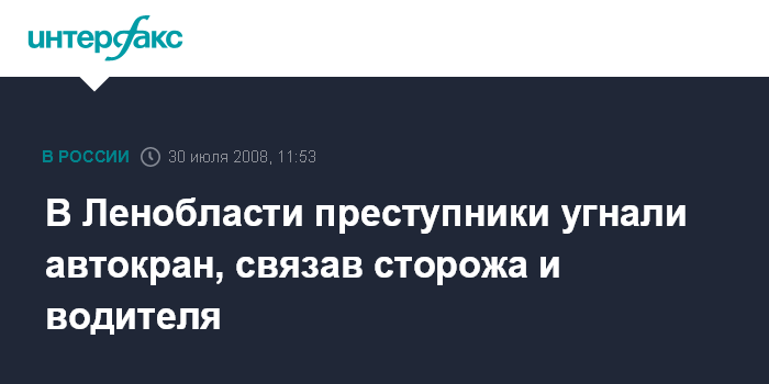 Москва. 30 июля. INTERFAX.RU - В деревне Глинки Ленинградской области четверо разбойников угнали автокран КамАЗ, сообщил "Интерфаксу" в среду источник в правоохранительных органах.