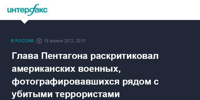 Вашингтон. 18 апреля. INTERFAX.RU - Министр обороны США Леон Панетта заявил в среду, что резко осуждает действия американских военнослужащих, фотографировавшихся в Афганистане рядом с убитыми террористами-смертниками. Он отметил, что подавляющее большинство военных, проходящих службу в Афганистане, ни за что не стали бы делать подобные фотографии.