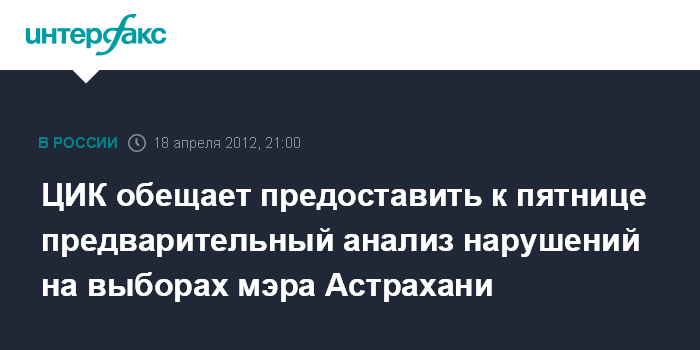 Москва. 18 апреля. INTERFAX.RU - Глава ЦИК Владимир Чуров сообщил, что к пятнице Центризбирком подготовит предварительную справку по итогам анализа результатов на выборах мэра Астрахани.