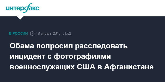 Вашингтон. 18 апреля. INTERFAX.RU - Президент США Барак Обама считает, что инцидент с американскими военнослужащими, которые фотографировались в Афганистане рядом с убитыми террористами, должен быть расследован.
