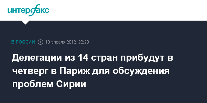 Париж. 19 апреля. ИНТЕРФАКС - Не менее 14 зарубежных делегаций примут участие в запланированной на четверг встрече министров иностранных дел стран, входящих в группу "друзей Сирии", заявил в среду глава МИД Франции Ален Жюппе.