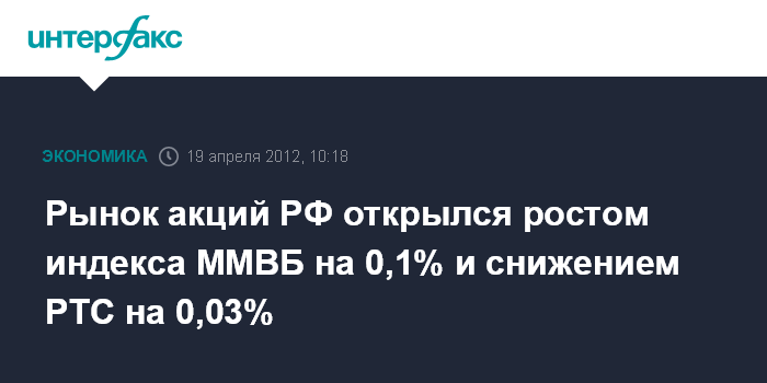 Москва. 19 апреля. INTERFAX.RU - Рынок акций РФ открылся в четверг разнополярной динамикой цен blue chips на фоне смешанных внешних факторов, индекс ММВБ вырос на 0,1%, индекс РТС просел на 0,03%.