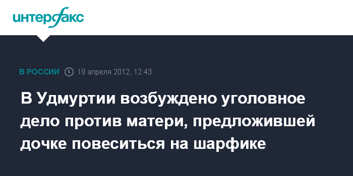 Ижевск. 19 апреля. INTERFAX.RU - Полиция Удмуртии возбудила уголовное дело в отношении местной жительницы, которая предложила своей дочери покончить жизнь самоубийством.