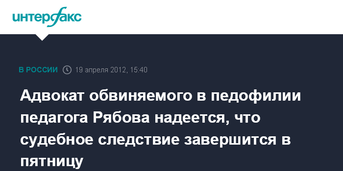 Москва. 19 апреля. INTERFAX.RU - Судебное следствие по делу Анатолия Рябова, преподававшего в музыкальной школе при Московской Государственной консерватории имени П.Чайковского, обвиняемого в педофилии, может завершиться уже в пятницу, 20 апреля, сообщил "Интерфаксу" адвокат Михаил Саркисов.