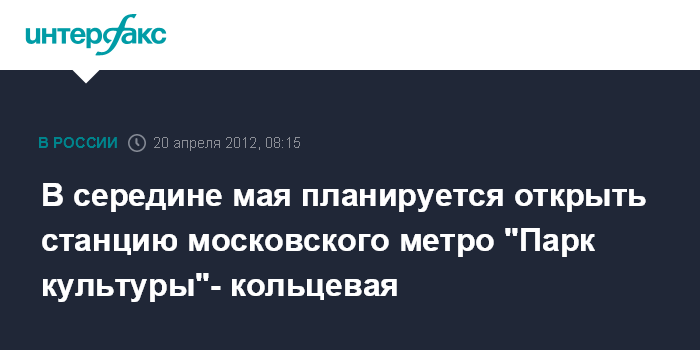 Москва. 20 апреля. INTERFAX.RU - Открытие станции метро "Парк Культуры" - кольцевая запланировано на середину мая, сообщили "Интерфаксу" в пресс-службе департамента транспорта и развития дорожно-транспортной инфраструктуры Москвы.