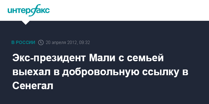Париж. 20 апреля. INTERFAX.RU - Отстраненный от власти в результате военного мятежа президент Мали Амаду Тумани Туре покинул родину и вылетел в добровольную ссылку в Сенегал, сообщает в пятницу французский телеканал ТФ1.