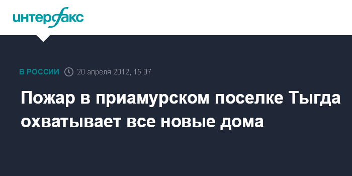 Благовещенск. 20 апреля. INTERFAX.RU - В поселке Тыгда Амурской области горят уже 65 зданий, сообщают в МЧС России. По данным представителя пресс-службы ДВРЦ МЧС России Ольги Алькиной, огнем охвачены 65 жилых домов и хозпостроек. Ранее сообщалось о 46 горящих домах.