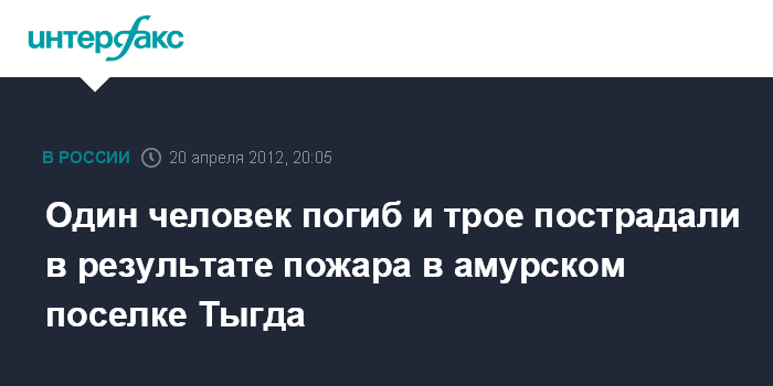 Москва. 20 апреля. INTERFAXZ.RU - В результате пожара в поселке Тыгда (Амурская область) погиб один человек, еще трое пострадали, сообщили "Интерфаксу" в управлении информации МЧС РФ.