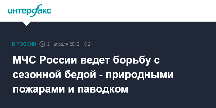 Москва. 21 апреля. INTERFAX.RU - В России за сутки потушено более 250 очагов природных пожаров на площади около 60 тысяч гектаров, паводками подтоплены 1,4 тыс. жилых домов, сообщает в субботу утром МЧС России.