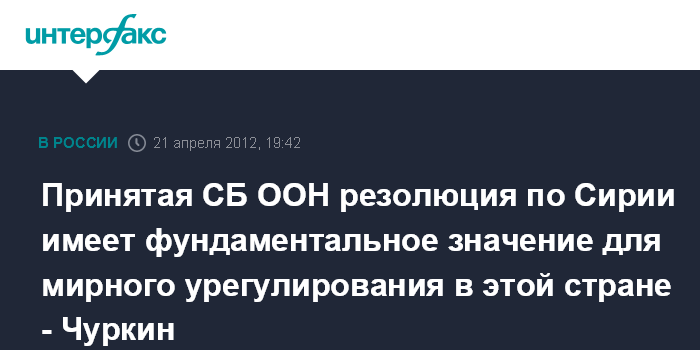 Нью-Йорк (ООН). 21 апреля. ИНТЕРФАКС - Принятая СБ ООН резолюция приобретает фундаментальное значение для продвижение процесса мирного урегулирования в Сирии, заявил, выступая на заседании Совета Безопасности, постпред РФ Виталий Чуркин.