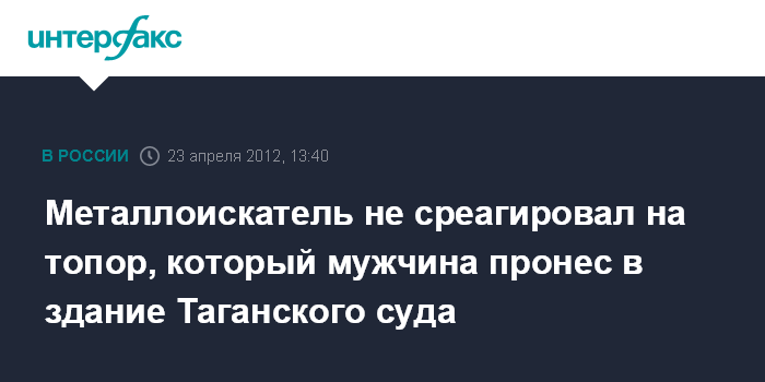 "В понедельник мужчина прошел в здание Таганского суда. При этом он был досмотрен судебными приставами и сотрудниками охраны, но металлоискатель на металлический предмет не среагировал", - сообщила "Интерфаксу" пресс-секретарь Таганского суда Ксения Ляпина.
