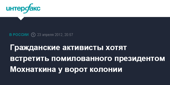 Москва. 23 апреля. INTERFAX.RU - Журналист Ольга Романова другие гражданские активисты намерены встретить помилованного Сергея Мохнаткина у ворот тверской колонии в среду.
