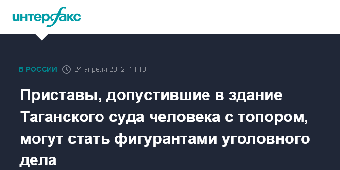 Москва. 24 апреля. INTERFAX.RU - Столичная прокуратура ставит вопрос о возбуждении уголовного дела в отношении судебных приставов, допустивших проникновение в Таганский районный суд столицы мужчины с топориком.
