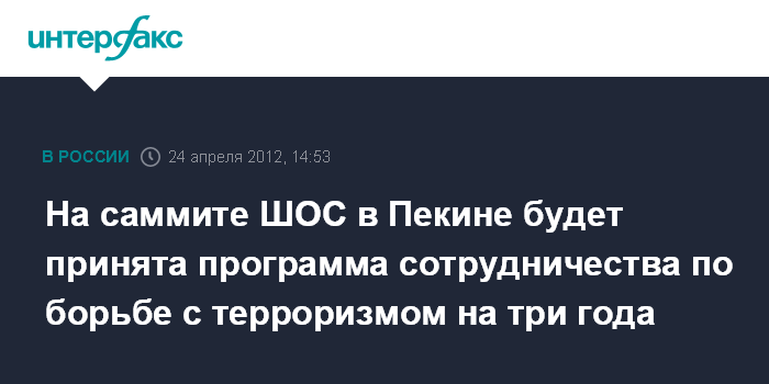 Пекин. 24 апреля. INTERFAX.RU - Программу сотрудничества по борьбе с терроризмом, сепаратизмом и экстремизмом на 2013-2015 годы планируется утвердить на июньском заседании Совета глав государств ШОС в Пекине, сообщил министр обороны РФ Анатолий Сердюков.