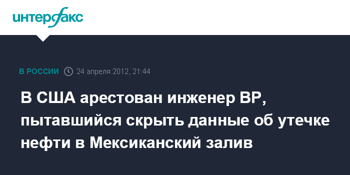 Вашингтон. 24 апреля. INTERFAX.RU - Американские власти арестовали инженера британской нефтяной компании BP по подозрению в попытке скрыть данные об утечке нефти после взрыва нефтяной платформы в Мексиканском заливе, заявили во вторник в министерстве юстиции США.