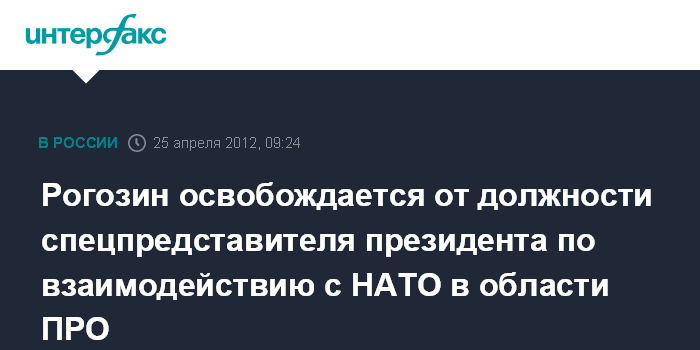 Москва. 25 апреля. INTERFAX.RU - Президент РФ Дмитрий Медведев подписал указ, в соответствии с которым Дмитрий Рогозин освобождается от должности специального представителя главы государства по взаимодействию с НАТО в области противоракетной обороны.