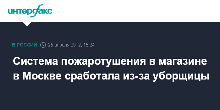 Москва. 25 апреля. INTERFAX.RU - Причиной срабатывания системы пожаротушения на востоке Москвы стала оплошность уборщицы, неаккуратно протершей от пыли пульт активации противопожарной установки, сообщил "Интерфаксу" начальник пресс-службы ГУ МЧС России по Москве Евгений Бобылев.