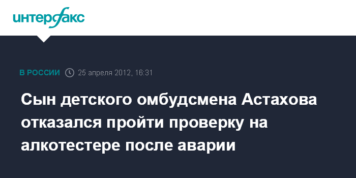 Сын детского омбудсмена Астахова отказался пройти проверку на алкотестере после аварии