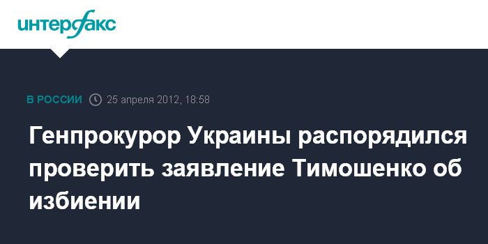 Киев. 25 апреля. INTERFAX.RU - Генеральный прокурор Украины Виктор Пшонка поручил проверить заявление экс-премьера Юлии Тимошенко о причинении ей телесных повреждений сотрудниками Качановской исправительной колонии.