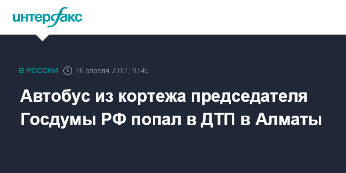 Алматы. 26 апреля. INTERFAX.RU - В Алмате произошло ДТП с участием автомобиля из кортежа председателя Госдумы РФ Сергея Нарышкина, посещающего Казахстан.