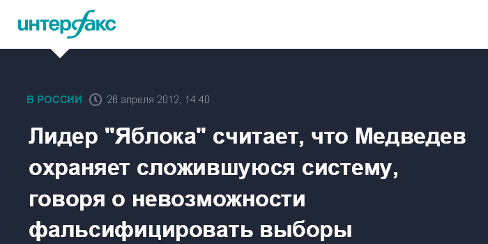 Лидер "Яблока" считает, что Медведев охраняет сложившуюся систему, говоря о невозможности фальсифицировать выборы
