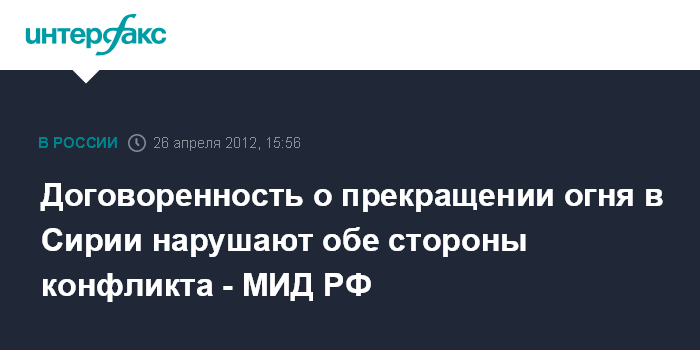 Москва. 26 апреля. INTERFAX.RU - Договоренности по перемирию в Сирии нарушаются как правительственными войсками, так и оппозицией, считает МИД РФ.