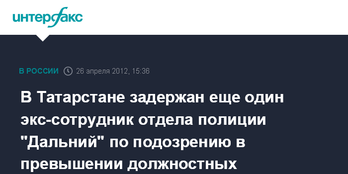 Москва. 26 апреля. INTERFAX.RU - В Татарстане задержан бывший оперуполномоченный уголовного розыска казанского отдела полиции "Дальний" Денис Васильев, который подозревается в издевательстве над задержанным.