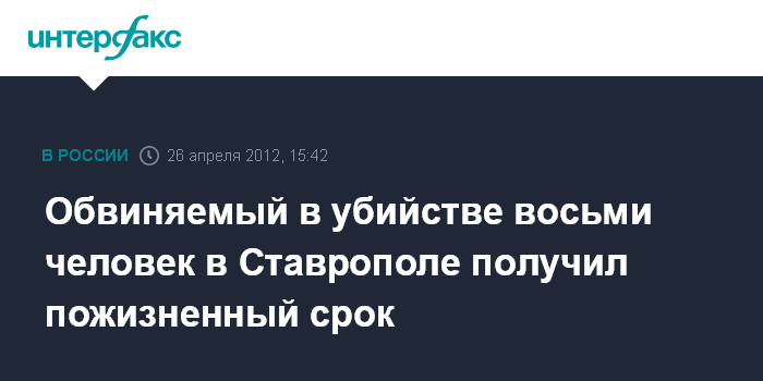 Москва. 26 апреля. INTERFAX.RU - Обвиняемый в убийстве восьми человек в Ставрополе Роман Губарев приговорен к пожизненному заключению, сообщил официальный представитель СК РФ Владимир Маркин.
