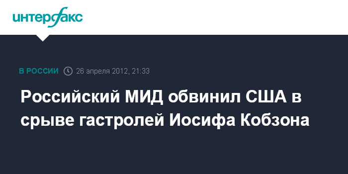 "С разочарованием и недоумением восприняли информацию об очередном отказе американских властей в выдаче въездной визы выдающемуся российскому певцу, депутату Государственной Думы России Иосифу Давыдовичу Кобзону. В результате срываются приуроченные к празднованию Дня Победы выступления нашего прославленного исполнителя в США, где его ждали многочисленные поклонники, в том числе проживающие там ветераны Великой Отечественной войны и другие наши соотечественники", - отмечается в комментарии официального представителя МИД России Александра Лукашевича, размещенном в четверг на сайте внешнеполитического ведомства.