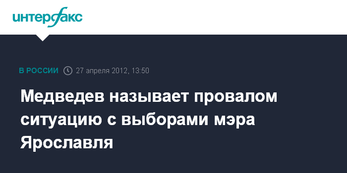 "Я говорю про Ярославль. Это неприемлемо, когда на праймериз побеждает один человек, который способен выиграть выборы, а губернатор принимает решение об участии другого, исходя из того, что у него есть собственные представления о том, как должна строиться политическая жизнь. Это неприемлемо, это провал", - заявил Д.Медведев на встрече с активом партии "Единая Россия".