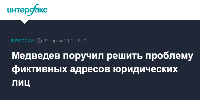 Горки.27 апреля. INTERFAX.RU - Президент РФ Дмитрий Медведев поручил рассмотреть вопрос об исключении при государственной регистрации юридического лица требования о наличии юридического адреса.